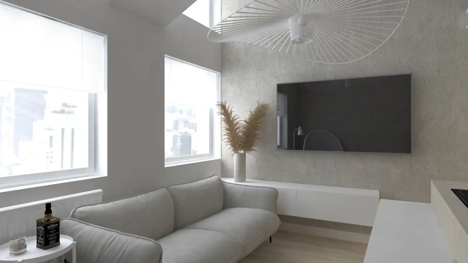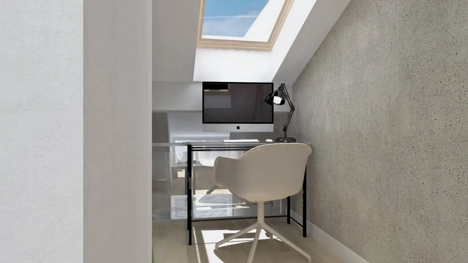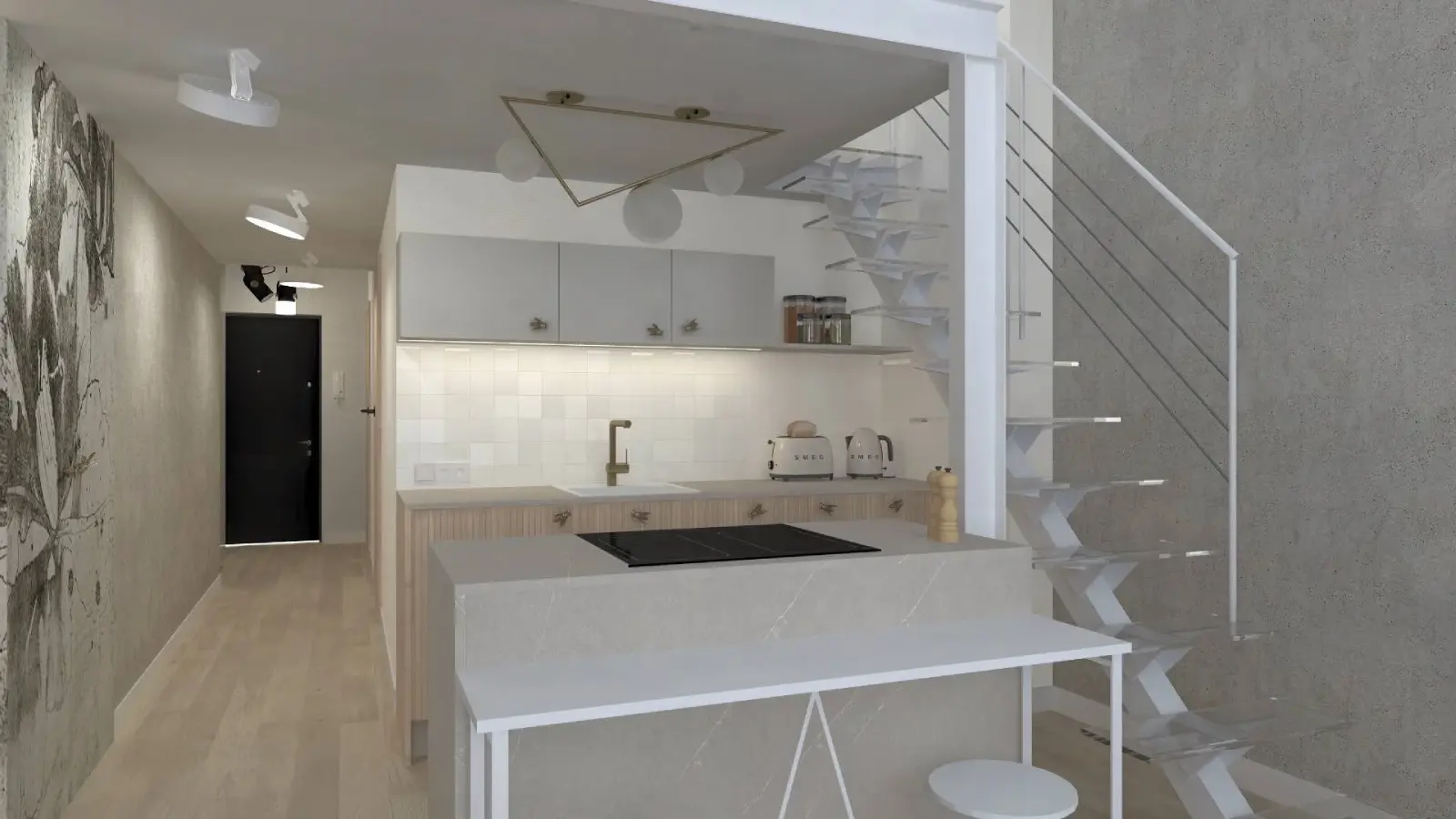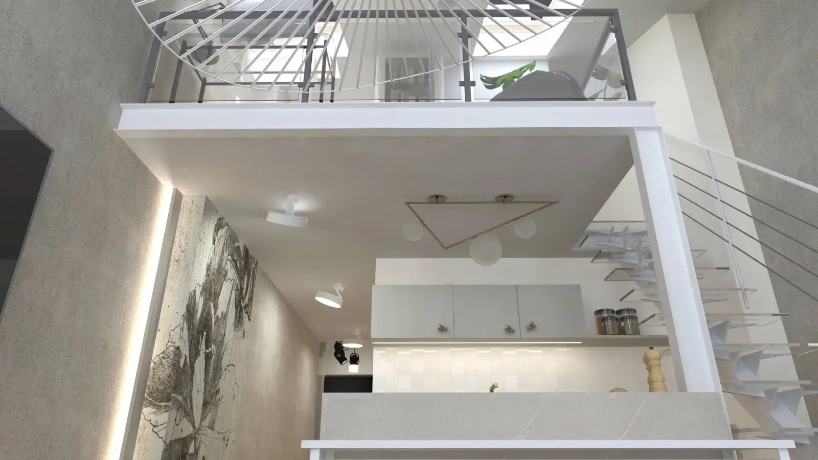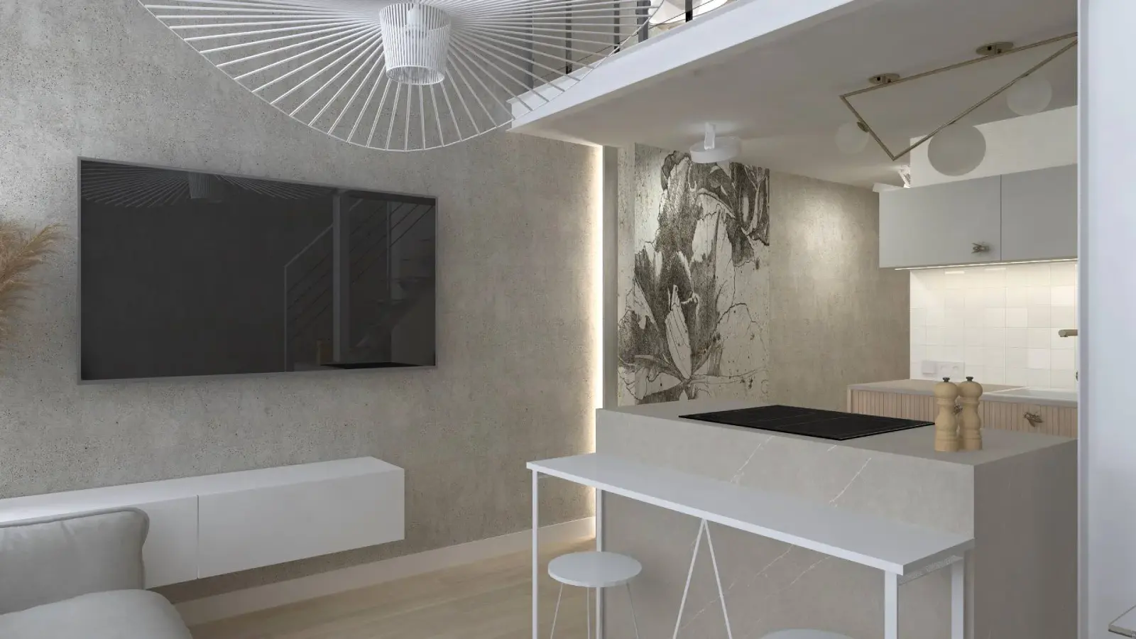 Projekt mieszkania w nadbudowie jednej z kamienic w Krakowie. Kuchnia otwarta na salon, antresola z sypialnią oraz kącikiem do czytania a także łazienka oraz pokój gościnny. Ściany pokryte betonem architektonicznym.
