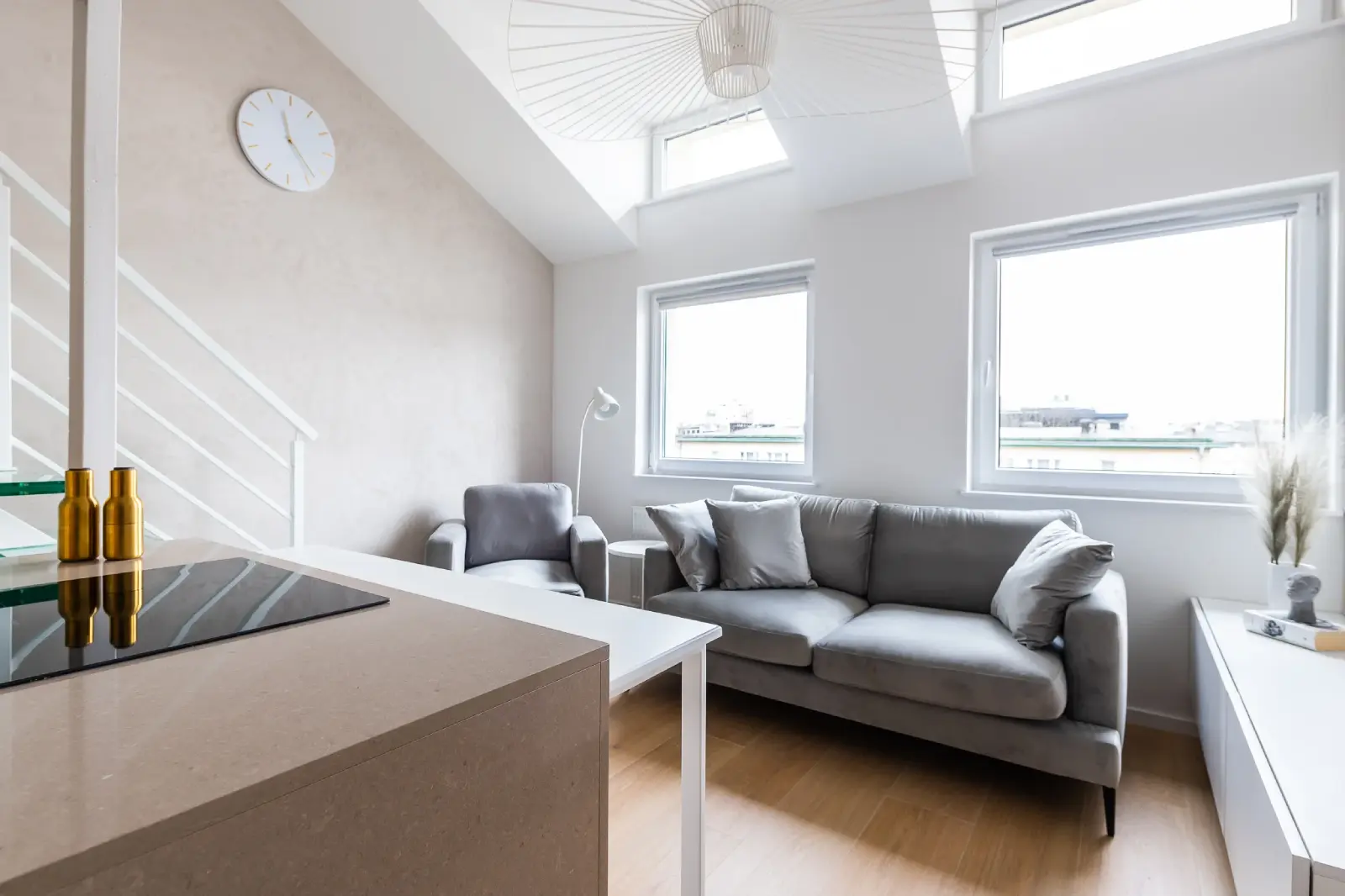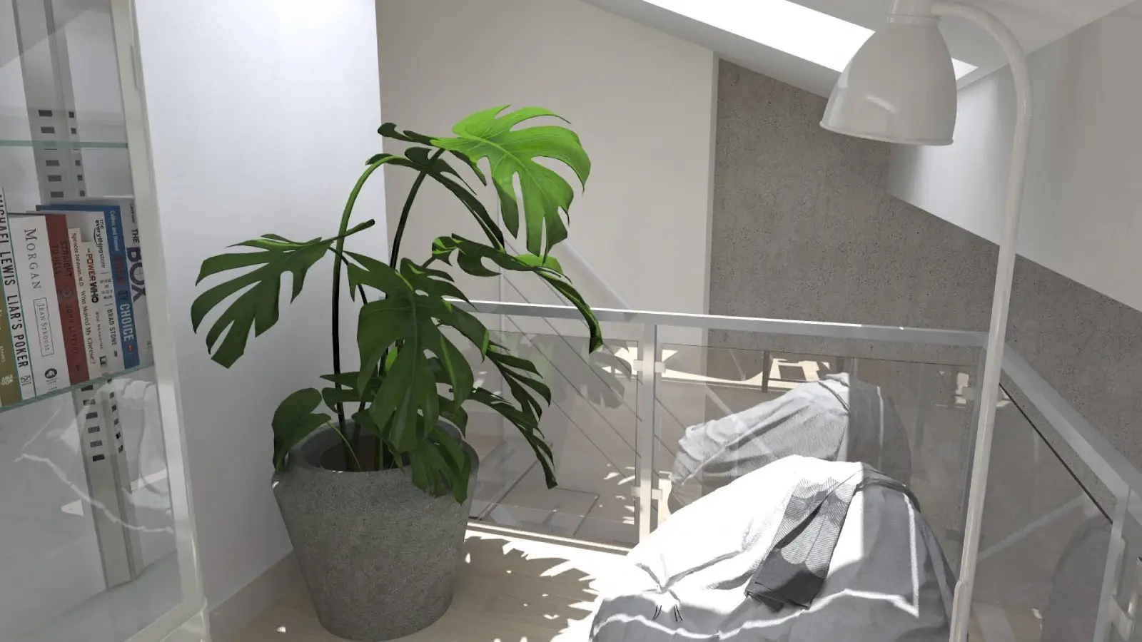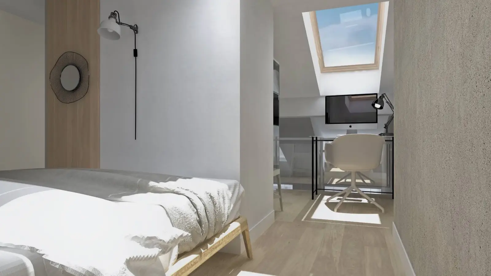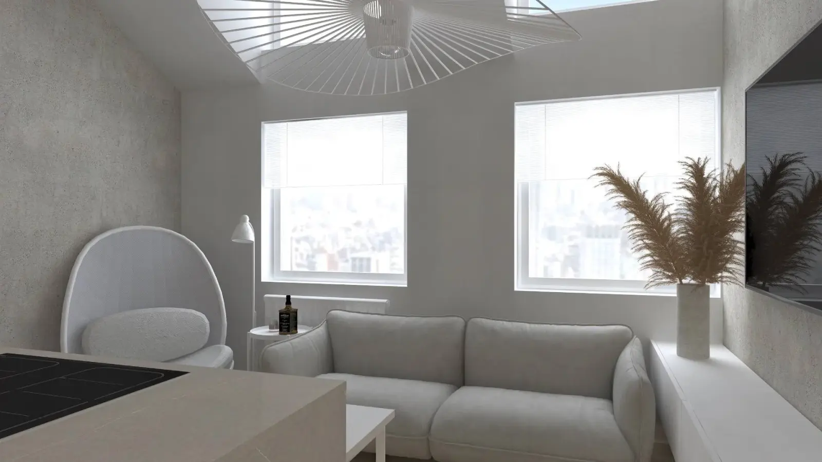 Projekt mieszkania w nadbudowie jednej z kamienic w Krakowie. Kuchnia otwarta na salon, antresola z sypialnią oraz kącikiem do czytania a także łazienka oraz pokój gościnny. Ściany pokryte betonem architektonicznym.