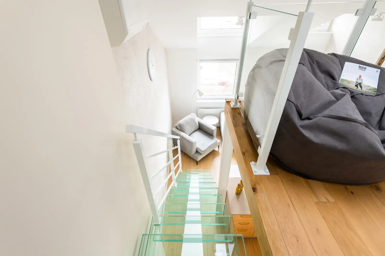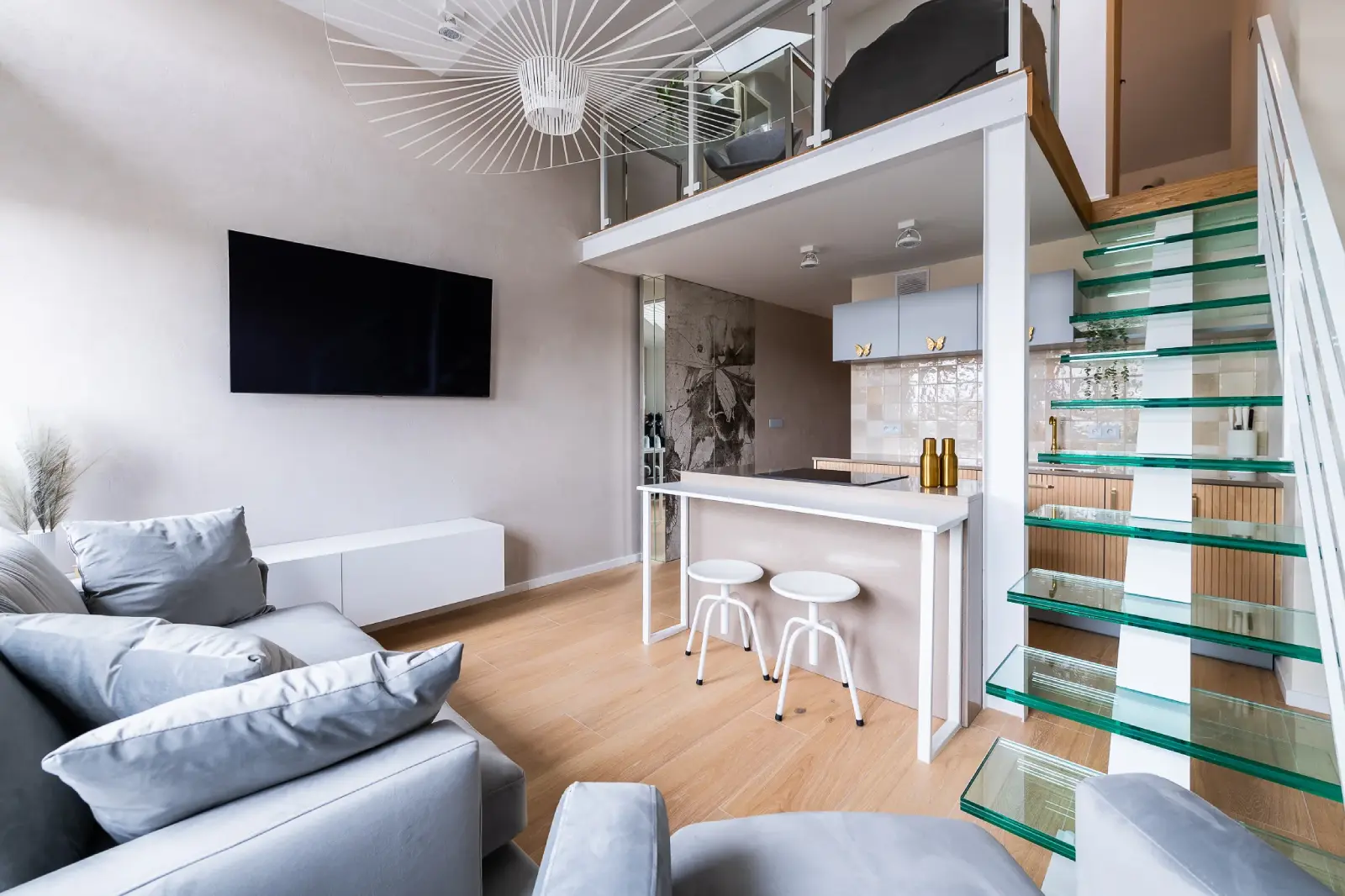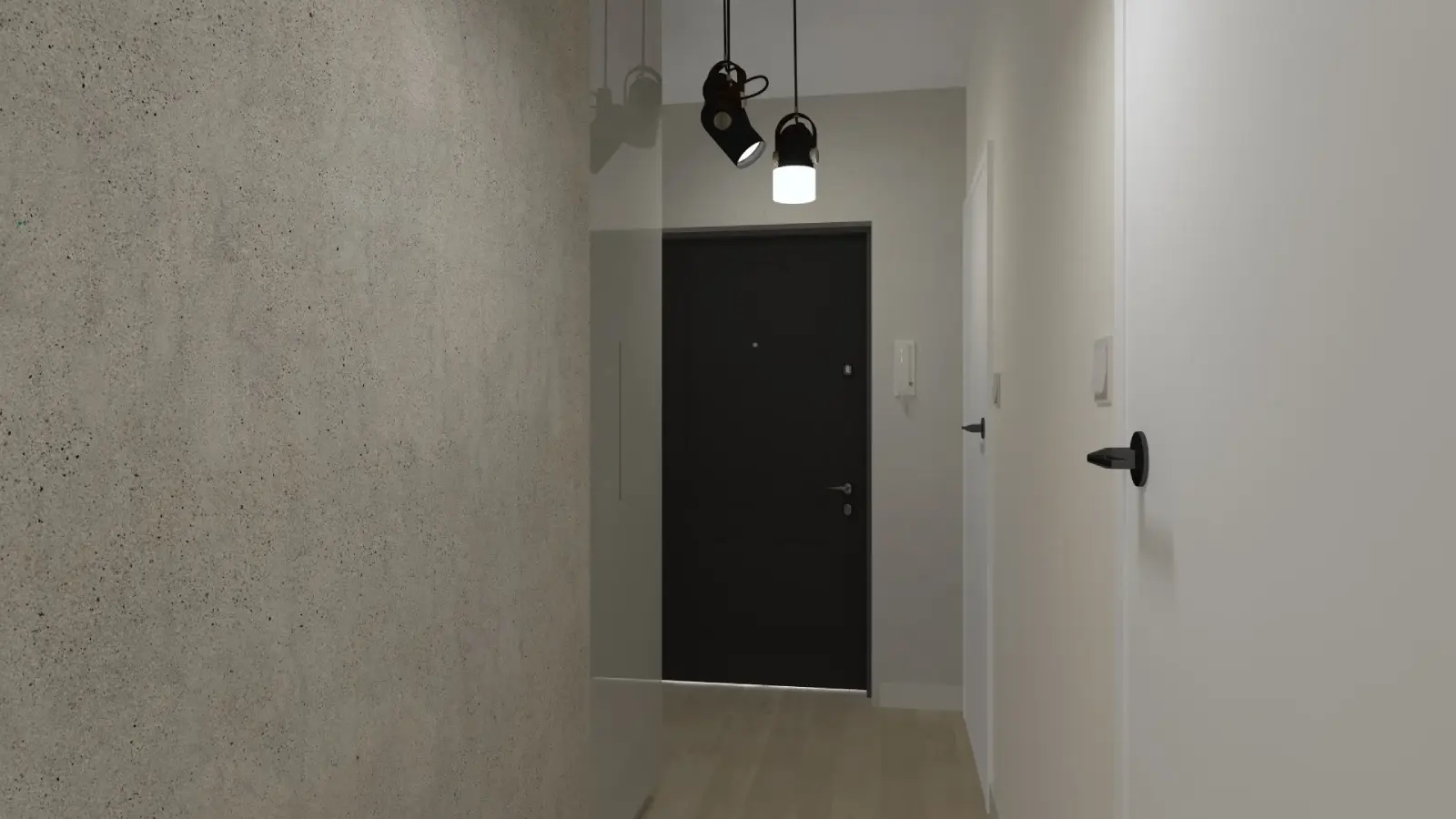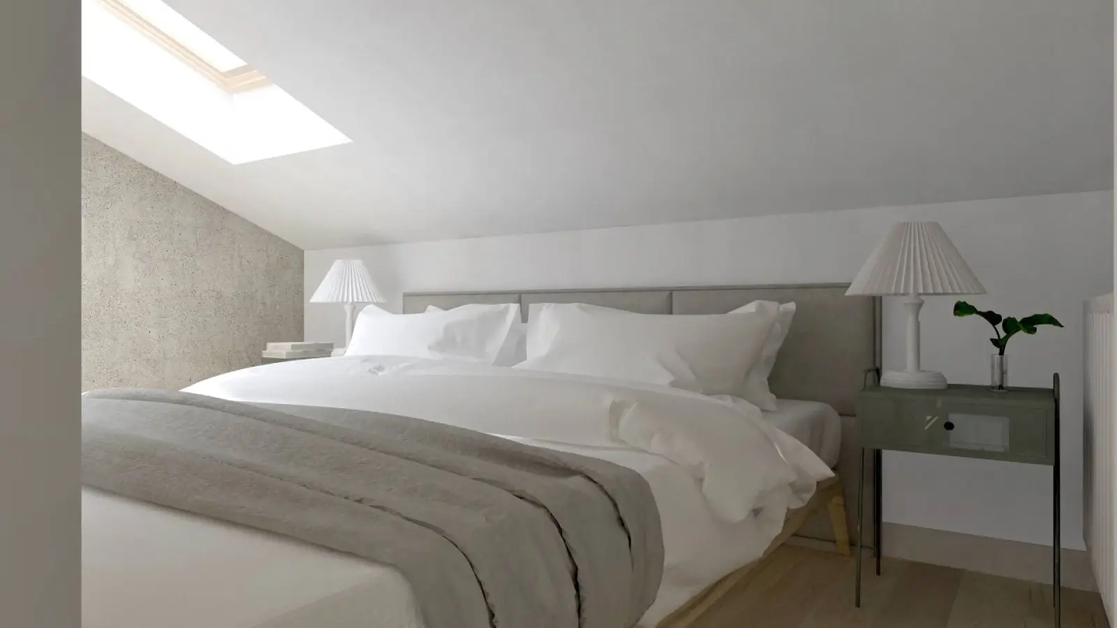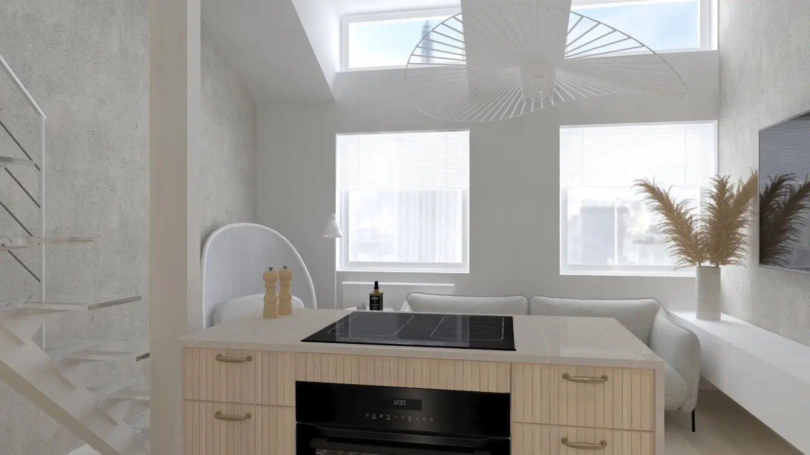 Projekt mieszkania w nadbudowie jednej z kamienic w Krakowie. Kuchnia otwarta na salon, antresola z sypialnią oraz kącikiem do czytania a także łazienka oraz pokój gościnny. Ściany pokryte betonem architektonicznym.