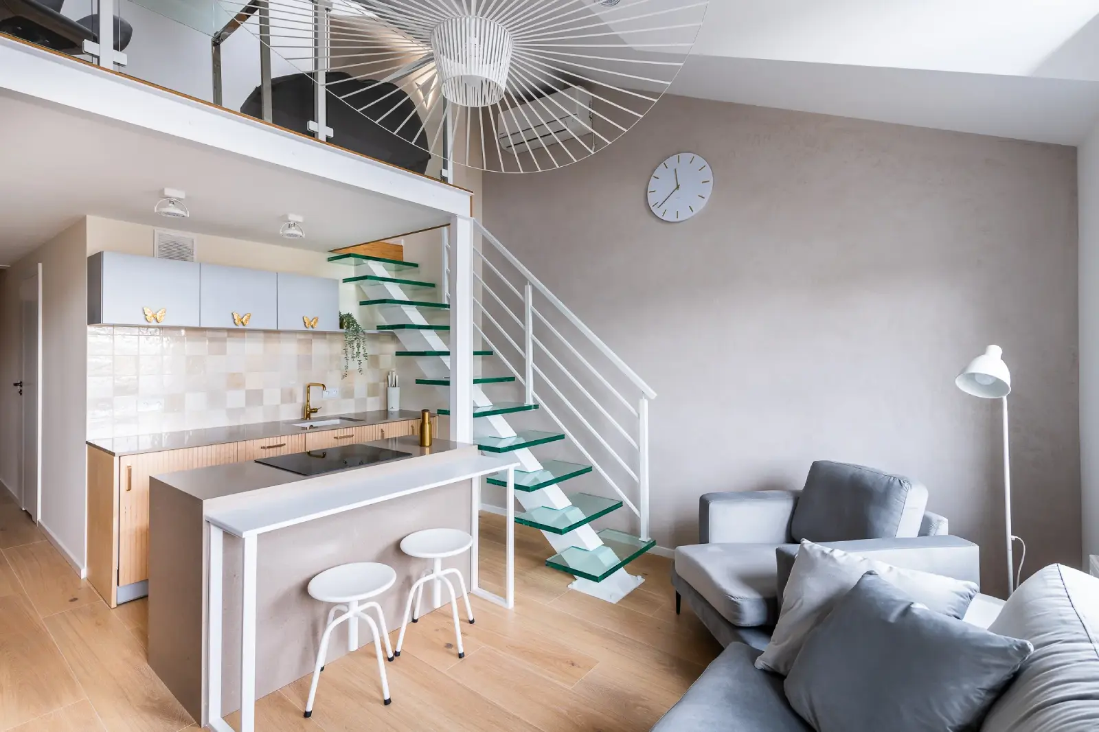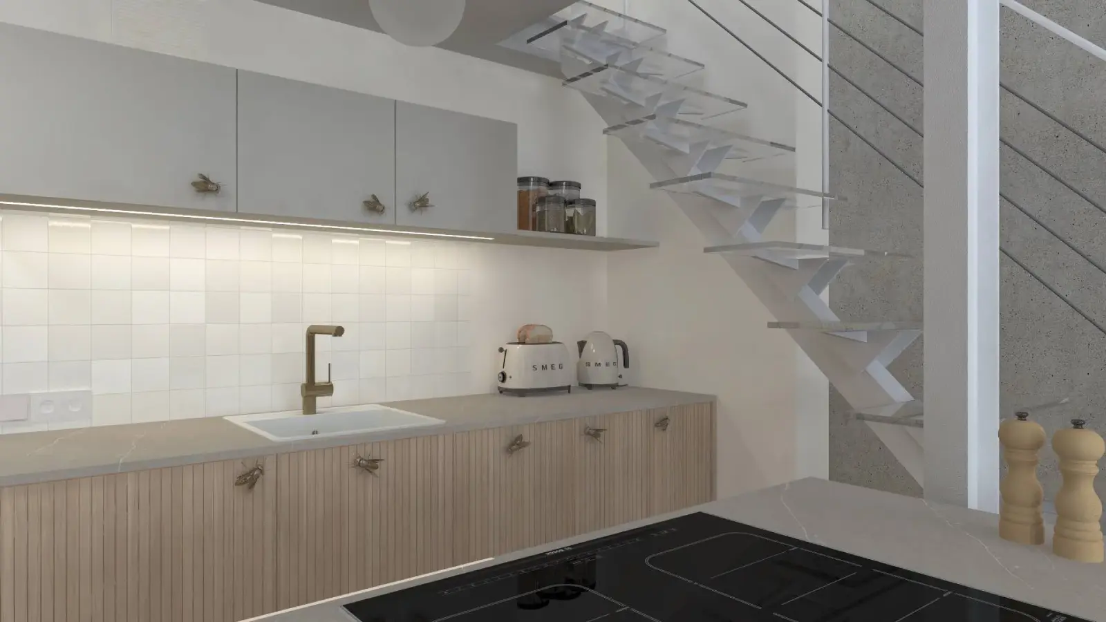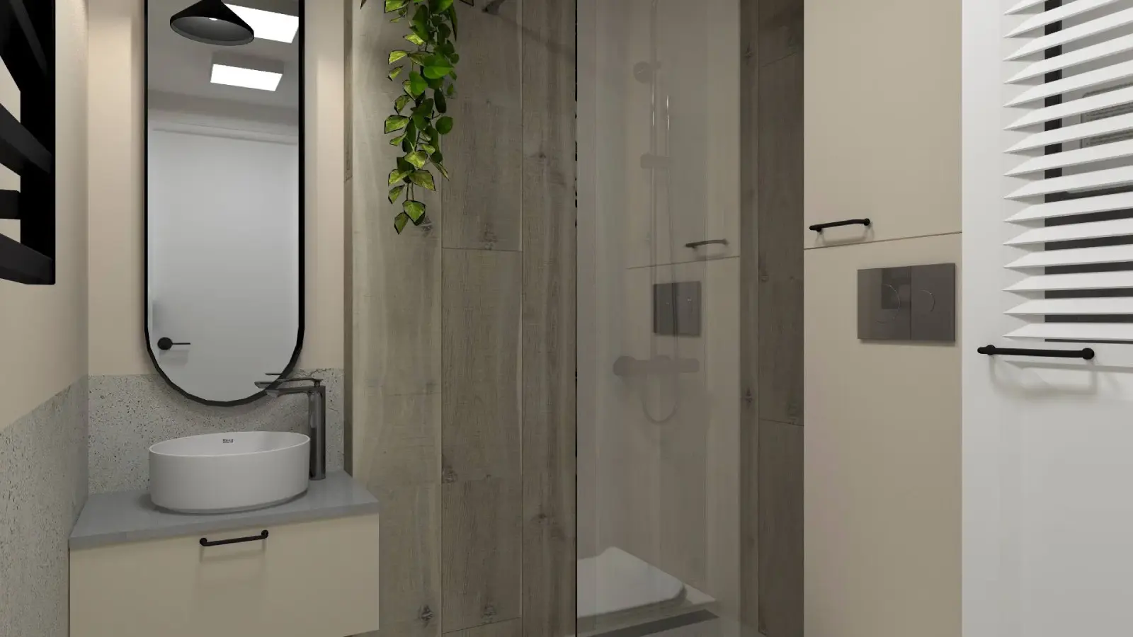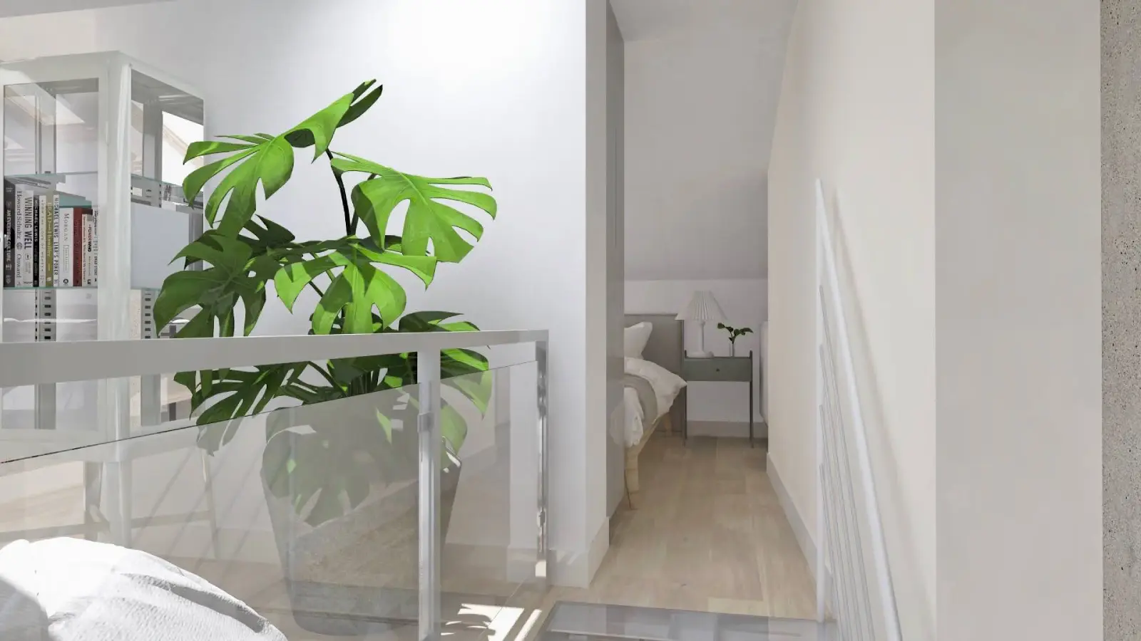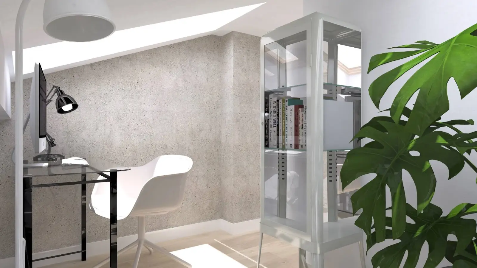 Projekt mieszkania w nadbudowie jednej z kamienic w Krakowie. Kuchnia otwarta na salon, antresola z sypialnią oraz kącikiem do czytania a także łazienka oraz pokój gościnny. Ściany pokryte betonem architektonicznym.