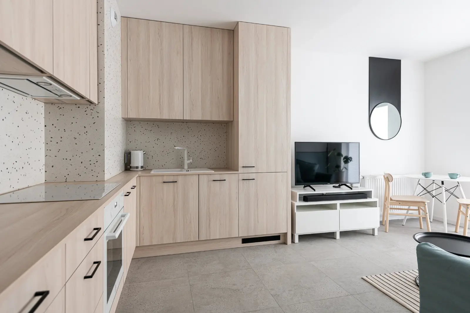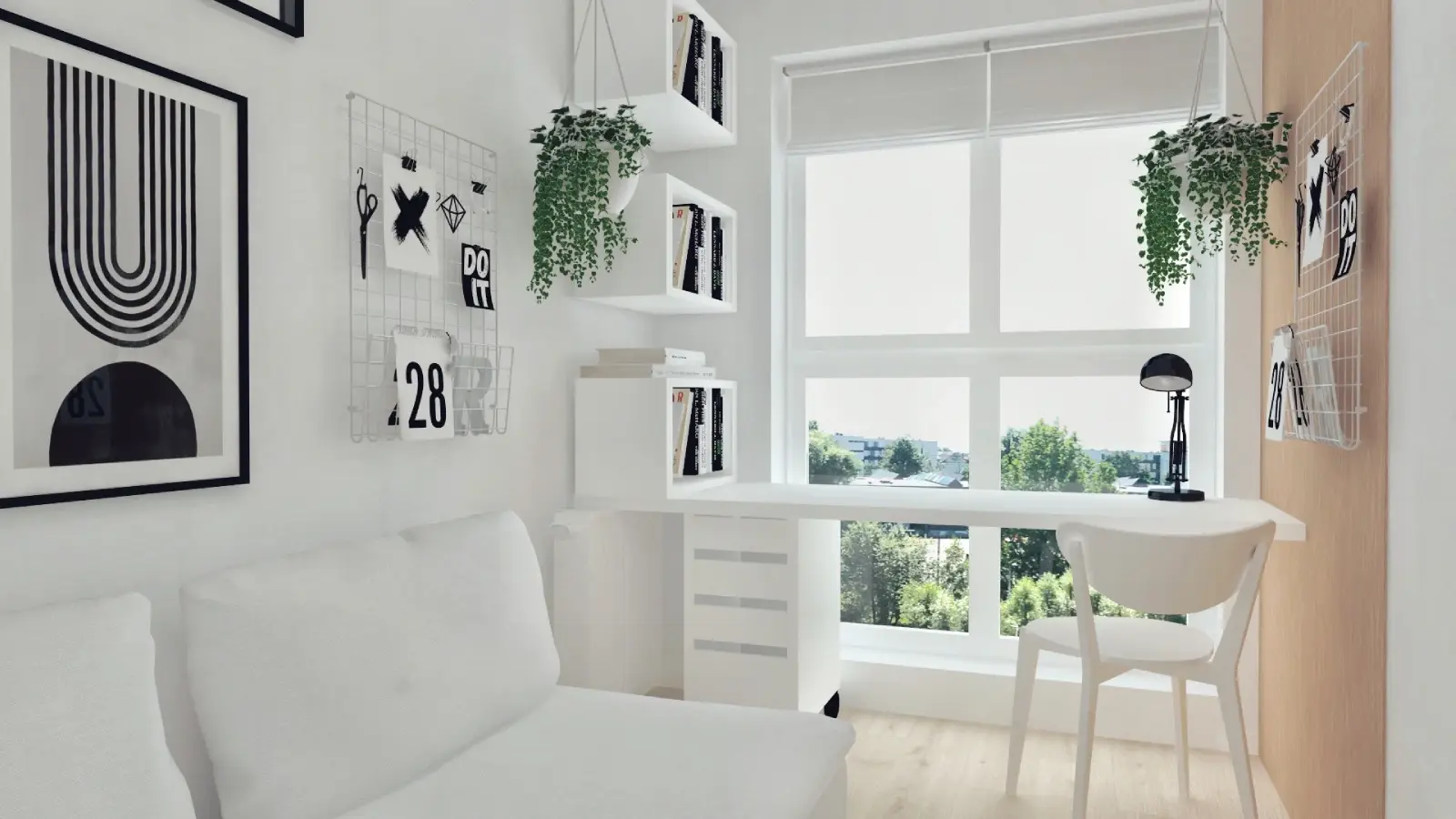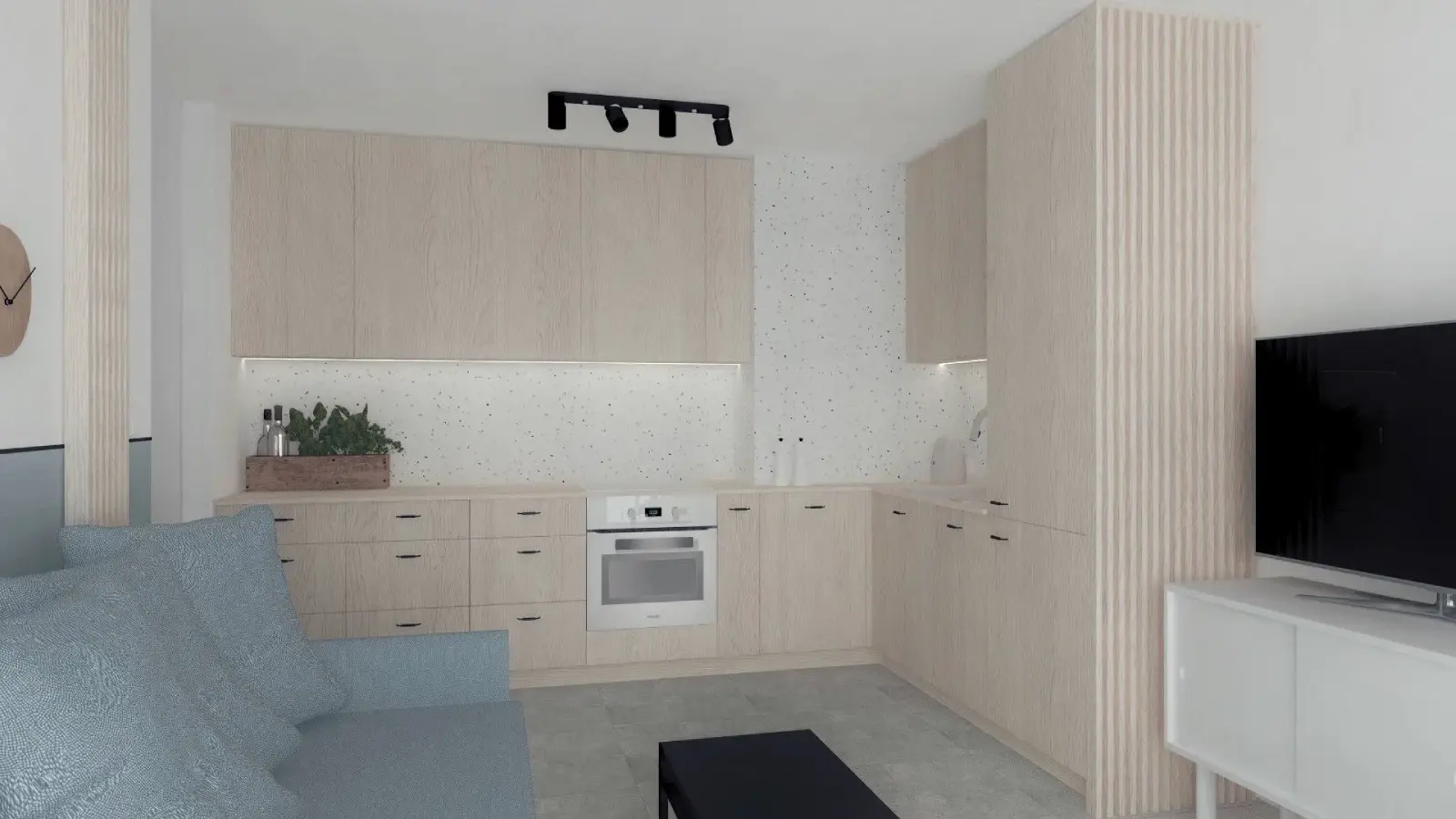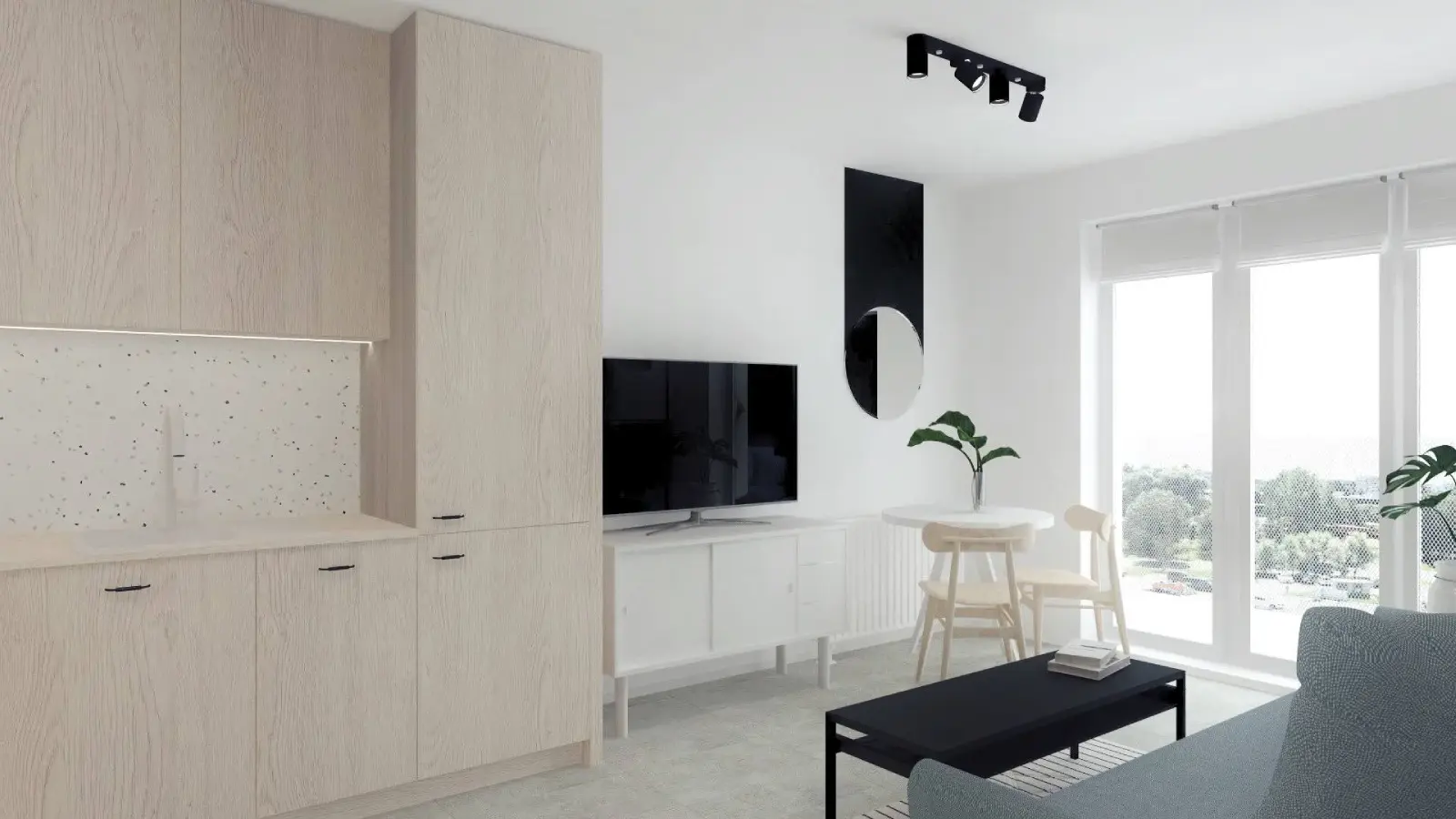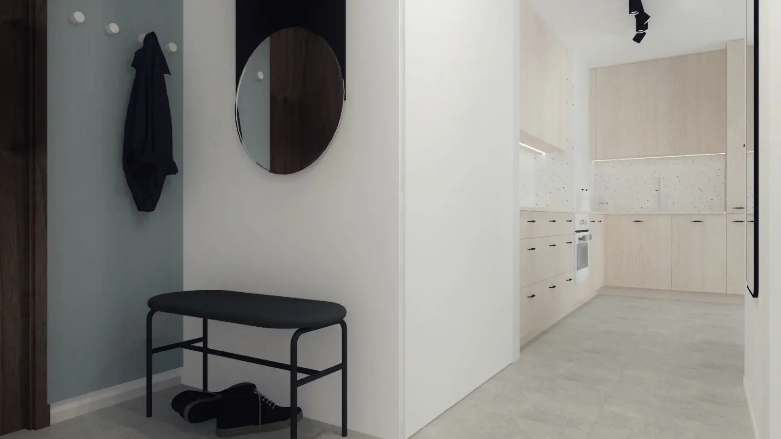 Kompleksowy projekt mieszkania ulokowanego w Katowicach w inwestycji Murapol Nowy Bażantów. Salon z kuchnią, gabinet/pokój gościnny, sypialnia oraz łazienka. Stonowane kolory z drobnymi smaczkami jak choćby płytki lastryko w łazience oraz kuchni.
